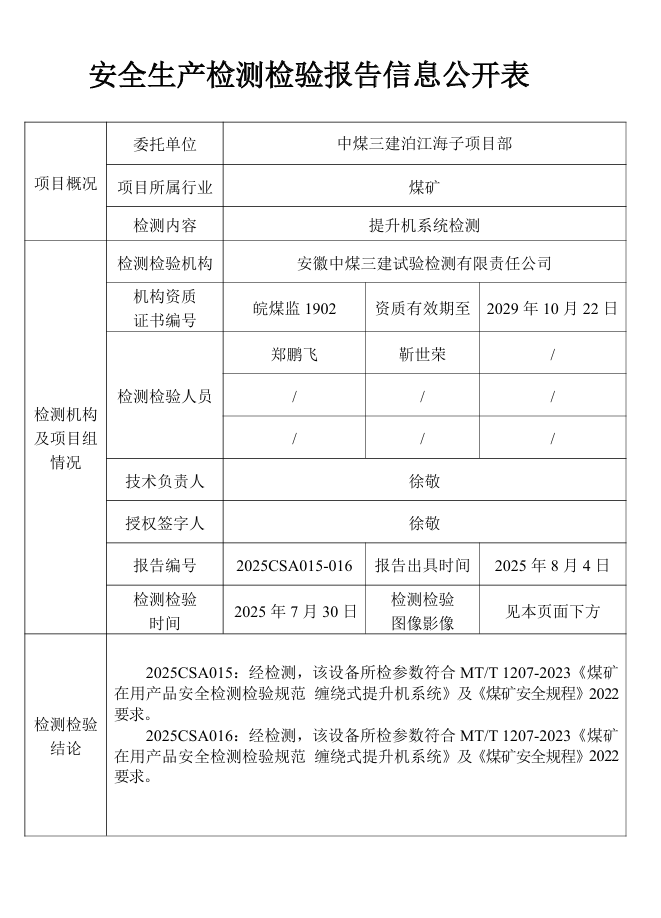 所检参数符合MT/T 1207-2023《煤矿在用产品安全检测检验规范 缠绕式提升机系统》及《煤矿安全规程》2022要求。