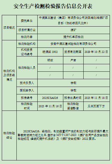 2025CSA026:经检测,制动装置所产生的制动力矩与实际提升最大静载荷旋转力矩之比K值符合MT/T 1207-2023《煤矿在用产品安全检测检验规范 缠绕式提升机系统》及《煤矿安全规程》2022要求。